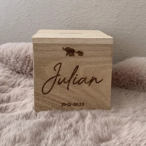 Op zoek naar een leuk en persoonlijk (kraam-)cadeau? Deze leuke houten spaarpot is niet alleen heel erg handig, maar staat ook heel leuk op de kinderkamers.