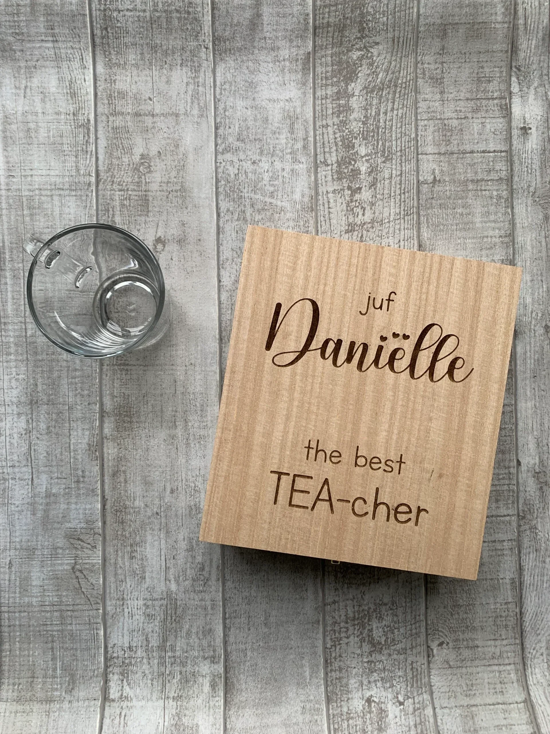 Deze geweldige houten theedoos is geheel naar wens te personaliseren en super leuk om cadeau te doen aan de juf of meester!